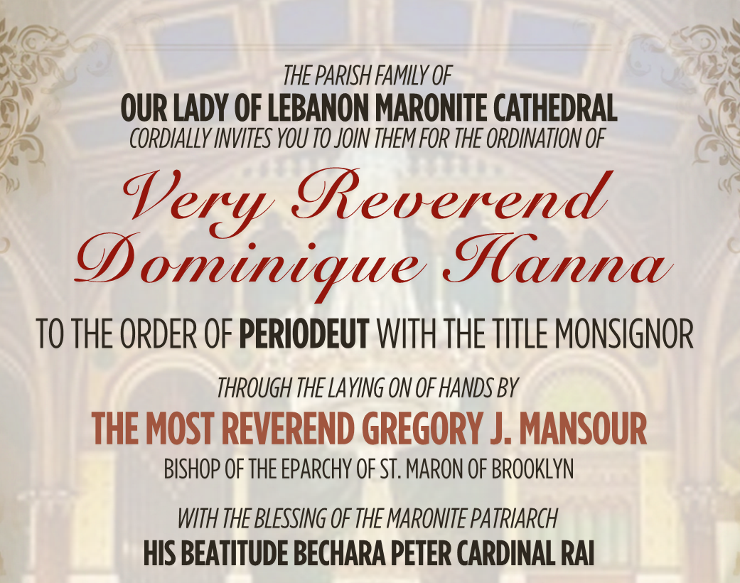 The parish family of Our Lady of Lebanon Maronite Cathedral cordially invites you to join them for the ordination of Very Reverend Dominique Hanna to the Order of Periodeut with the title Monsignor. Through the laying on of hands by the Most Reverend Gregory J. Mansour, Bishop of the Eparchy of St. Maron of Brooklyn. With the blessing of the Maronite Patriarch His Beatitude Bechara Peter Cardinal Rai.